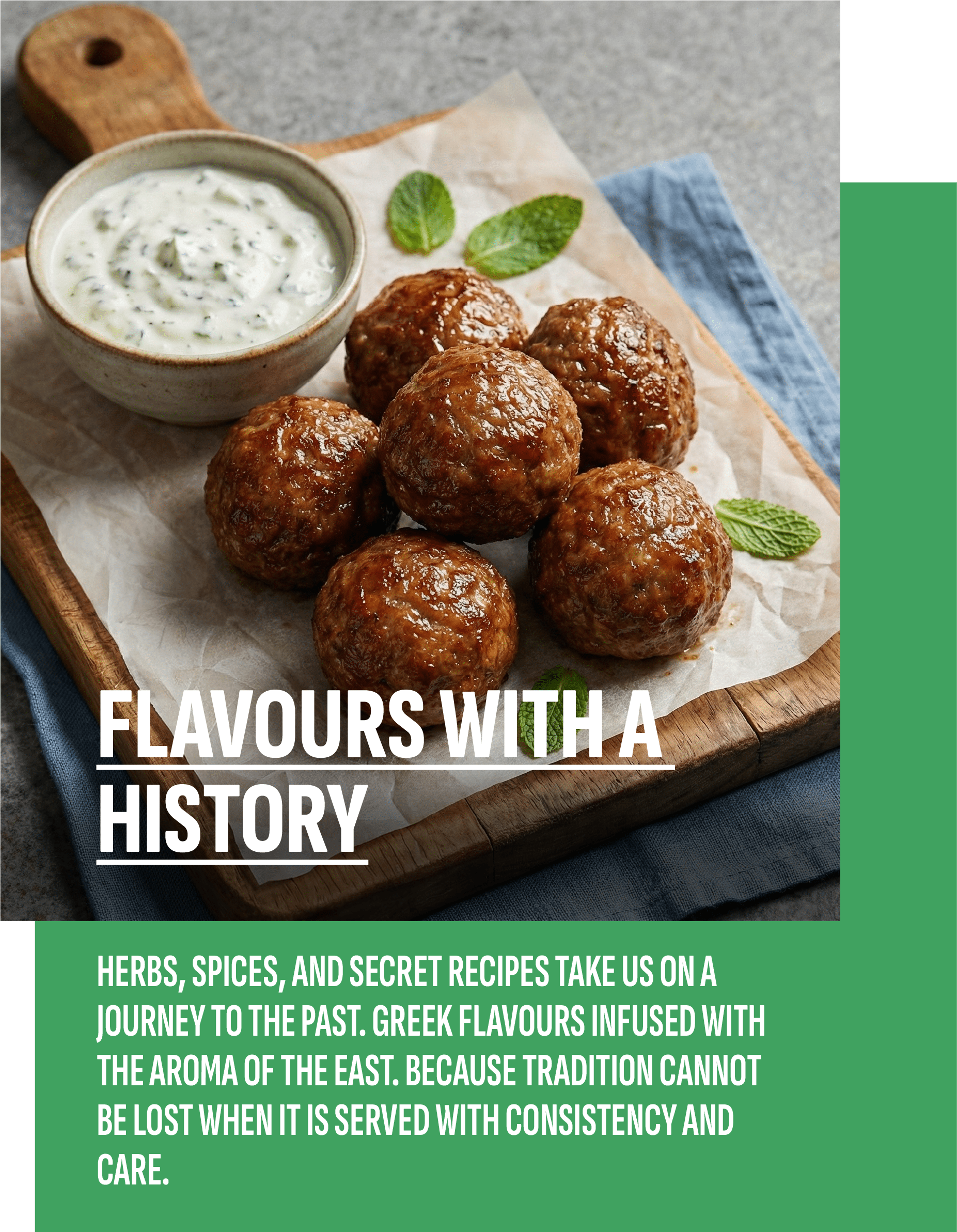 FLAVOURS WITH A HISTORY. HERBS, SPICES, AND SECRET RECIPES TAKE US ON A JOURNEY TO THE PAST. GREEK FLAVOURS INFUSED WITH THE AROMA OF THE EAST. BECAUSE TRADITION CANNOT BE LOST WHEN IT IS SERVED WITH CONSISTENCY AND CARE.