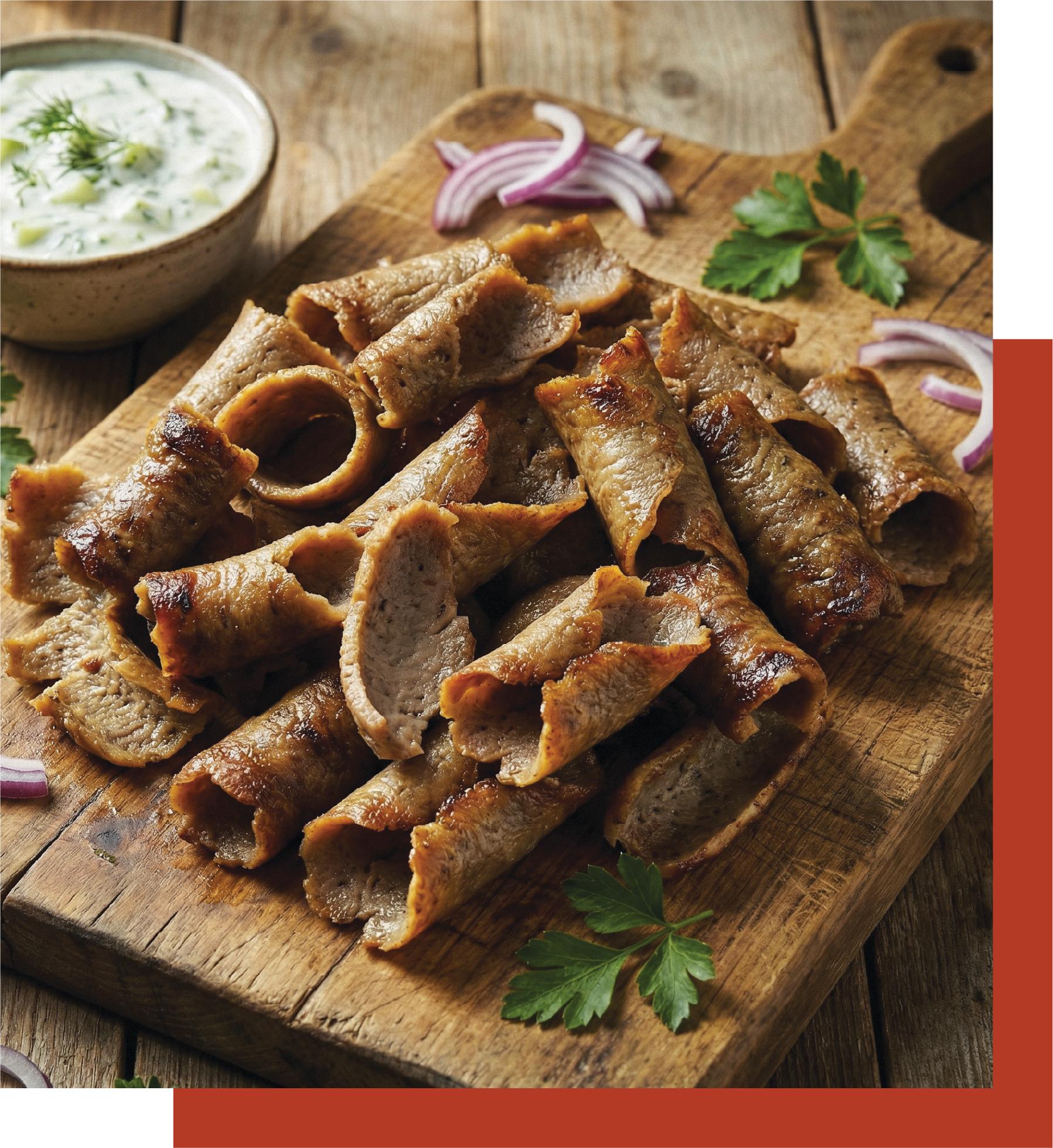 Αυθεντικός βορειοελλαδίτικος γύρος ντονέρ, μαριναρισμένος και προψημένος για μια μοναδική γευστική εμπειρία.